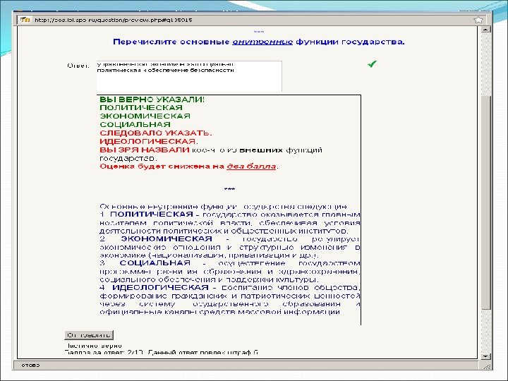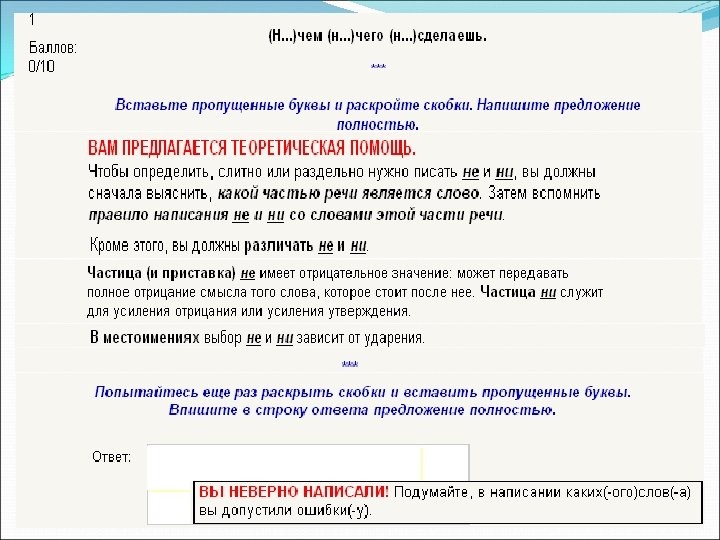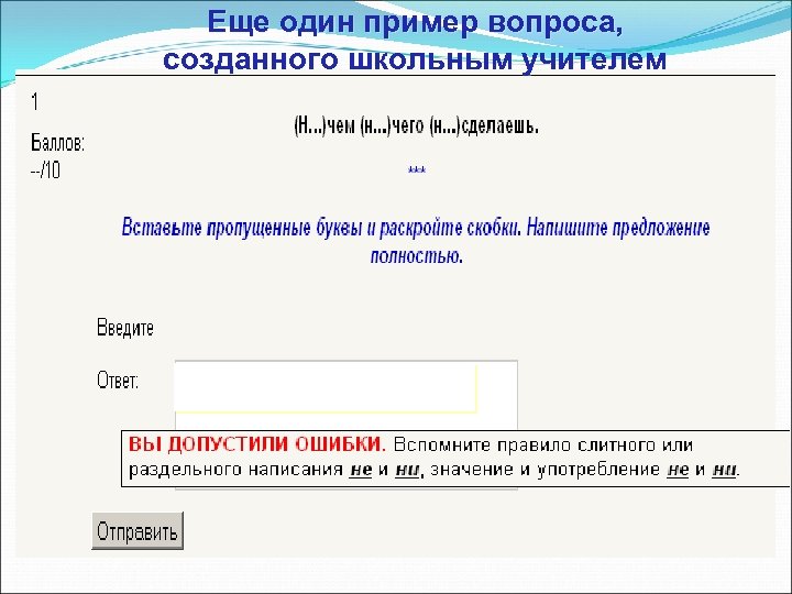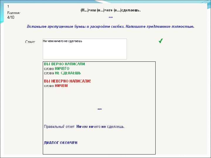 ПРИ ТЕКУЩЕМ И РУБЕЖНОМ АВТОМАТИЗИРОВАННОМ КОНТРОЛЕ ЗАКРЫТЫЕ ТЕСТЫ. ТИПЫ ДИАЛОГА. ►Наличие дистракторов дезориентирует обучающегося (с большой ► Простой запрос (данет) долей вероятности он запомнит не правильный вариант, а тот, который выбрал). ►Запрос с синтаксисом для ответа (форматный ввод) ►Высокая доля подсказки. Выбор из предложенных вариантов мобилизует не истинные знания, а знания-узнавания. ► Меню - простое и расширенное (выбор одного варианта, выбор нескольких вариантов) ►Часто подбор дистракторов сильно затруднен, что не позволяет выполнить ► Вопросвсе методические требования, предъявляемые к для выборочно-конструируемого корректному тестовому вопросу. ответа (упорядочение множества, установление соответствий элементов двух множеств и т. д. ) ►Невозможно, зачастую, сформулировать закрытые вопросы на многие положения учебного материала просто. Применяемые автоматизированные средства не обеспечивают достижения учебных целей