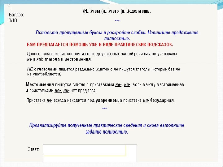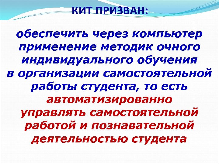 КИТ ПРИЗВАН: Индивидуально указать на основные моменты обеспечить через компьютер учебного материала, которые необходимо применение методик очного твердо усвоить. индивидуального обучения Выявить индивидуальные незнания (лакуны в организации самостоятельной знаний), адресно и реактивно их заполнить. работы студента, то есть автоматизированноучебный Уместно предъявить актуальный управлять самостоятельной материал в формулировке учебного задания, в обучающих комментариях и пояснениях. работой и познавательной деятельностью студента Персонально заставить выучить то, что необходимо знать.