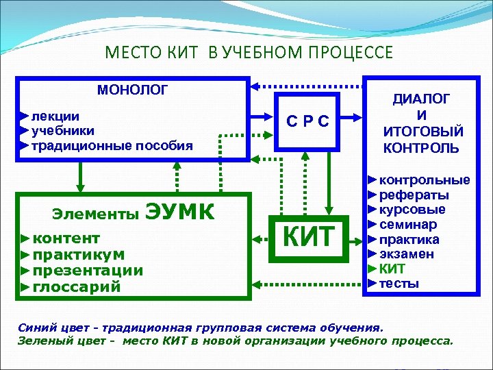 МЕСТО КИТ В УЧЕБНОМ ПРОЦЕССЕ МОНОЛОГ ►лекции ►учебники ►традиционные пособия Элементы ►контент ►практикум ►презентации ►глоссарий ЭУМК СРС КИТ ДИАЛОГ И ИТОГОВЫЙ КОНТРОЛЬ ►контрольные ►рефераты ►курсовые ►семинар ►практика ►экзамен ►КИТ ►тесты Синий цвет - традиционная групповая система обучения. Зеленый цвет - место КИТ в новой организации учебного процесса.