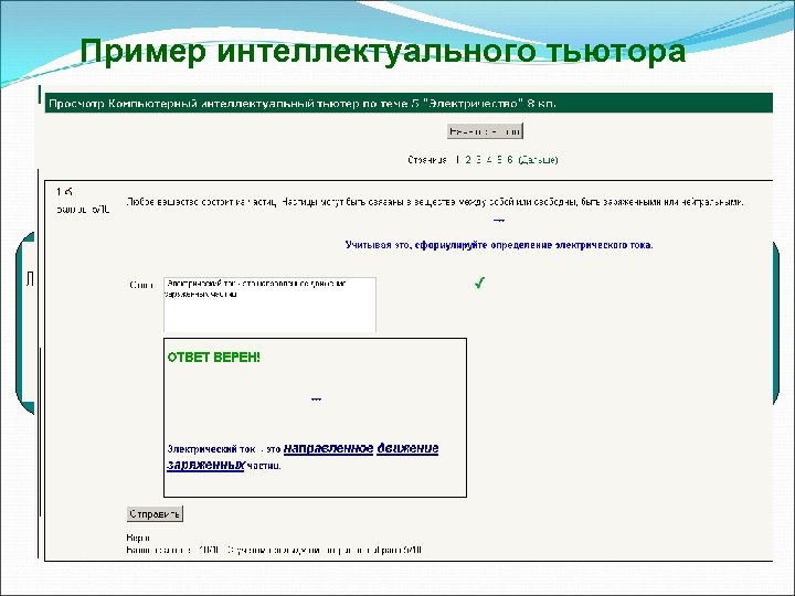 Пример интеллектуального тьютора Электрический ток – направленное движение частиц Электрический токток этодвижение частиц Электрический ––это направленное движение заряженных частиц