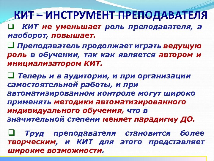 КИТ – ИНСТРУМЕНТ ПРЕПОДАВАТЕЛЯ q КИТ не уменьшает роль преподавателя, а наоборот, повышает. q Преподаватель продолжает играть ведущую роль в обучении, так как является автором и инициализатором КИТ. q Теперь и в аудитории, и при организации самостоятельной работы, и при автоматизированном контроле могут широко применять методики автоматизированного индивидуального обучения, что в значительной степени меняет парадигму ДО. q Труд преподавателя становится более творческим, и КИТ для этого представляет широкие возможности.
