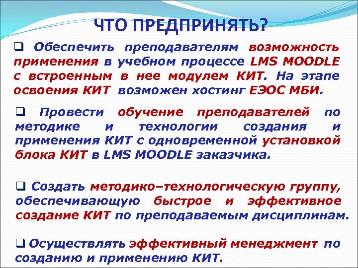 ЧТО ПРЕДПРИНЯТЬ? q Обеспечить преподавателям возможность применения в учебном процессе LMS MOODLE с встроенным в нее модулем КИТ. На этапе освоения КИТ возможен хостинг ЕЭОС МБИ. q Провести обучение преподавателей по методике и технологии создания и применения КИТ с одновременной установкой блока КИТ в LMS MOODLE заказчика. q Создать методико–технологическую группу, обеспечивающую быстрое и эффективное создание КИТ по преподаваемым дисциплинам. q Осуществлять эффективный менеджмент по созданию и применению КИТ.