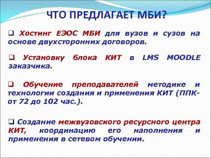 ЧТО ПРЕДЛАГАЕТ МБИ? q Хостинг ЕЭОС МБИ для вузов и сузов на основе двухсторонних договоров. q Установку заказчика. блока КИТ в LMS MOODLE q Обучение преподавателей методике и технологии создания и применения КИТ (ППКот 72 до 102 час. ). q Создание межвузовского ресурсного центра КИТ, координацию его наполнения и применения в сетевом обучении.