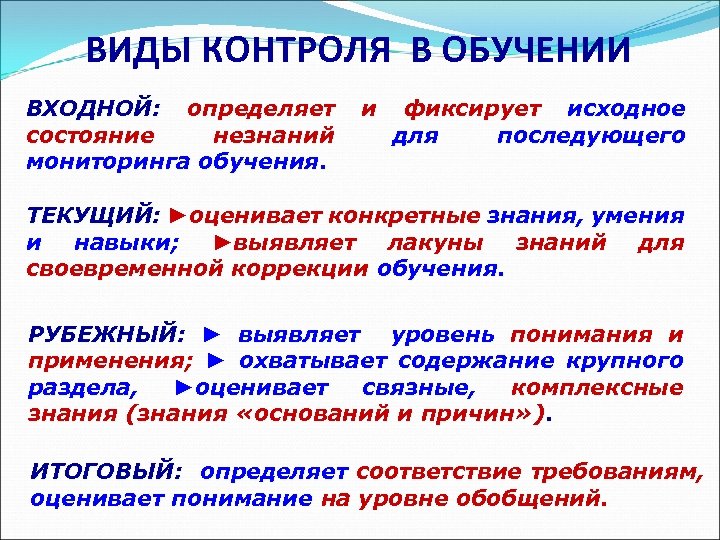ВИДЫ КОНТРОЛЯ В ОБУЧЕНИИ ВХОДНОЙ: определяет состояние незнаний мониторинга обучения. и фиксирует исходное для последующего ТЕКУЩИЙ: ►оценивает конкретные знания, умения и навыки; ►выявляет лакуны знаний для своевременной коррекции обучения. РУБЕЖНЫЙ: ► выявляет уровень понимания и применения; ► охватывает содержание крупного раздела, ►оценивает связные, комплексные знания (знания «оснований и причин» ). ИТОГОВЫЙ: определяет соответствие требованиям, оценивает понимание на уровне обобщений.