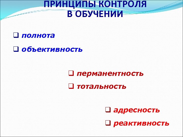 ПРИНЦИПЫ КОНТРОЛЯ В ОБУЧЕНИИ q полнота q объективность q перманентность q тотальность q адресность q реактивность