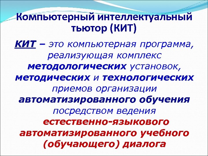 Компьютерный интеллектуальный тьютор (КИТ) КИТ – это компьютерная программа, реализующая комплекс методологических установок, методических и технологических приемов организации автоматизированного обучения посредством ведения естественно-языкового автоматизированного учебного (обучающего) диалога