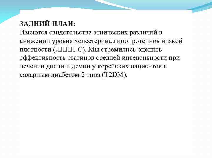 ЗАДНИЙ ПЛАН: Имеются свидетельства этнических различий в снижении уровня холестерина липопротеинов низкой плотности (ЛПНП-С). Мы стремились оценить эффективность статинов средней интенсивности при лечении дислипидемии у корейских пациентов с сахарным диабетом 2 типа (T 2 DM).