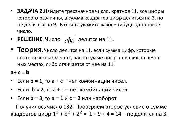 ЗАДАЧА 3. Найдите четырехзначное число, кратное 88, все цифры которого различны и четны. В ответе укажите какое–нибудь одно такое число. РЕШЕНИЕ. Число делится на 88. 88 = 8· 11, для делимости на 11 a + c = b + d и (три последние цифры в записи числа) должно делиться на 8. Помним, что все цифры четные и различные. Четные цифры это – 0, 2, 4, 6, 8. 2 + 4 = 6 + 0, то есть число 2640. Проверяем делимость на 8. 640 делиться на 8. Другую последовательность этих цифр взять нельзя (2046), потому что не выполняется делимость на 8. Рассмотрим цифры 2, 4, 6, 8. 2 + 8 = 4 + 6. Получим число 2486 или 8426 или 8624 или 6248. Первые два числа не подходят – не выполняется признак делимости на 8, а вот два последних числа соответствуют второму условию (8624; 6248). ОТВЕТ. 2640; 8624; 6248.