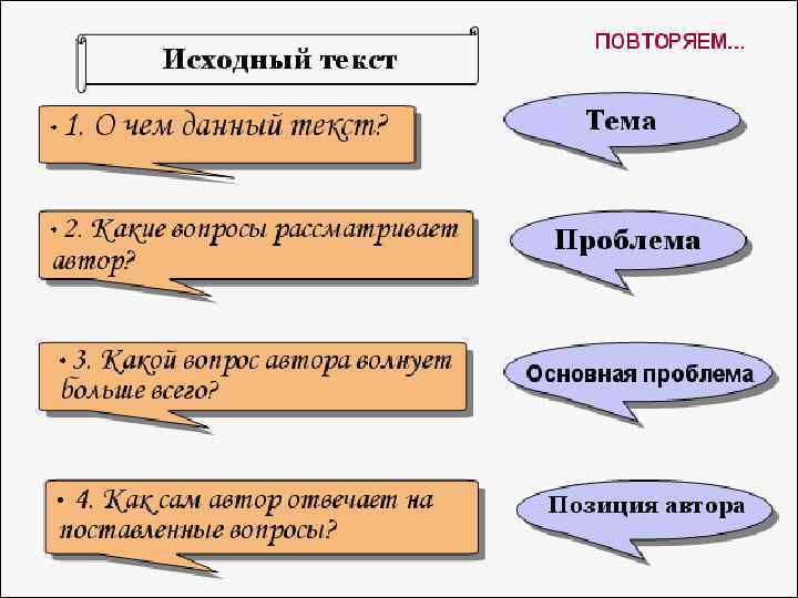 • Слово "проблема" (или "вопрос") обязательно должно прозвучать в тексте. Причем не надо путать проблему с авторской позицией. Позиция обозначается как тезис (законченное предложение), а проблема формулируется либо как вопрос, либо сочетанием слова «проблема» с существительным в родительном падеже. Кроме того, очень важно различать проблему, над которой размышляет автор текста, и проблемы, которые возникают в его собственной жизни. Мы пишем о первой. (Многие путают и пишут: «У автора есть проблема» … Звучит довольно забавно).