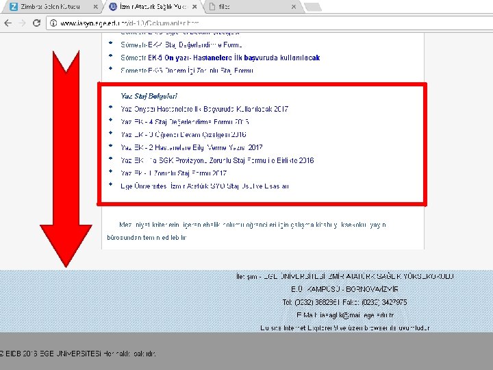 HASTANENİN ÖĞRENCİYİ KABULUNDEN SONRA ÖĞRENCİ ‘nin elinde sadece; • EK-1: ZORUNLU STAJ FORMU (2 adet; bunlardan biri zarf içine yerleştirilerek hastaneye geri gönderilmiş olacak, diğeri okulda kalacaktır) Ardından devam eden slaytlardaki işlemleri gerçekleştirerek okula başvuru yapılacaktır.