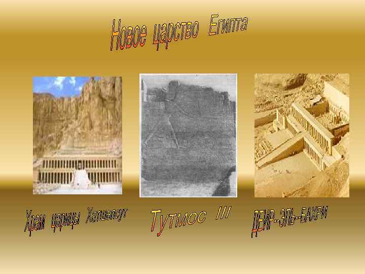 Около 1552 г. до н. э. фараон Яхмос основал XVIII династию, захватил Аварис и изгнал гиксосов. Страна вступила в период территориальной экспансии, времени наибольшего экономического могущества и культурного расцвета Египта. Тутмос I продолжил завоевания. Его дочь Хатшепсут проводила мирную политику, занимаясь развитием торгового обмена и строительством Дейр-эль-Бахри. Тутмос III, наследовавший Хатшепсут, попытался стереть любое свидетельство о ней, приказав уничтожить многочисленные статуи царицы.