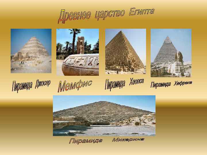 Древнее царство учёные датируют около 3 000 г. до н. э. В это время совершается ряд важных достижений, таких, как изобретение письменности, улучшение оросительной системы и политическое объединение Верхнего и Нижнего Египта. Тогда же был создан чиновничий аппарат, находившийся под контролем фараона. Расцвет Древнего Царства наступил в правление III, IV, V и VI династий, примерно между 2 700 и 2 160 гг. до н. э. Фараон Джосер из III династии (2640 — 2575) перенес столицу в Мемфис в дельте Нила, подчеркнув таким образом главенство Нижнего Египта. Джосер постарался укрепить свои позиции путем жесткой централизации административного управления и выдвижения культа солярного божества Ра в ущерб культу Гора. Наиболее выдающейся считается IV династия, когда, по предположению египтологов были выстроены колоссальные пирамиды Хеопса, Хефрена и Микерина, признанные одним из семи чудес света. Но так ли это? Современные исследования сегодня подвергают сомнению эту точку зрения. Ответ на этот вопрос ещё предстоит найти.