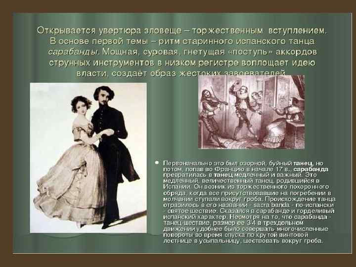 • Увертюра начинается медленным вступлением. • Первый мотив ритмически напоминает тяжеловесный испанский придворный танец «Сарабанда» и ассоциируется с образом испанских захватчиков