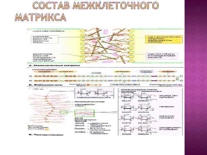 Коллагены - образуют нити, фибриллы, сетки и связки Протеогликаны – выполняют роль наполнителя. Благодаря отрицательному заряду, они связывают основную часть воды( гиалуроновая кислота, хондроитин сульфат и др. ) Адгезивные белки- связывают различные компоненты межклеточного матрикса. Они обеспечивают фиксацию клеток в межклеточном матриксе. Консистенция внеклеточного матрикса зависит от соотношения коллагена и протеогликанов (хрящ – много протеогликанов, связки – много коллагена) В базальных пластинах преобладают протеогликаны, образуя структурную опору и выполняют роль молекулярного сита