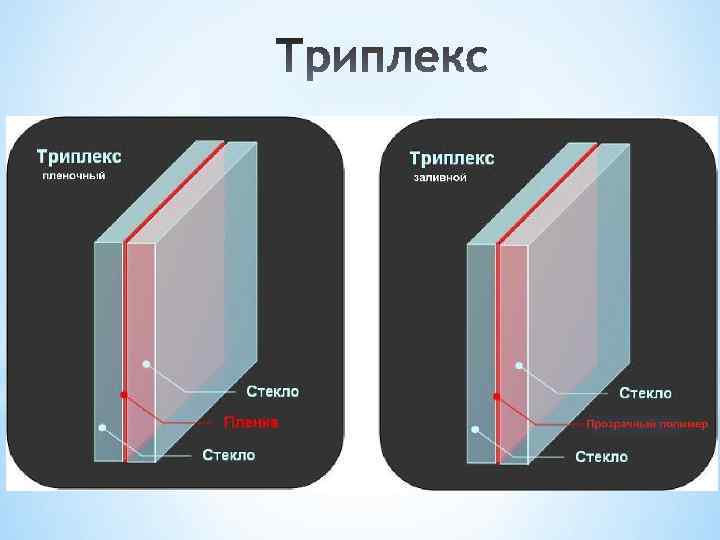 Три плекс — многослойное стекло (два или более органических или силикатных стекла, склеенные между собой специальной полимерной плёнкой или фотоотверждаемой композицией, способной при ударе удерживать осколки). Как правило, изготавливается путём прессования при нагреве.