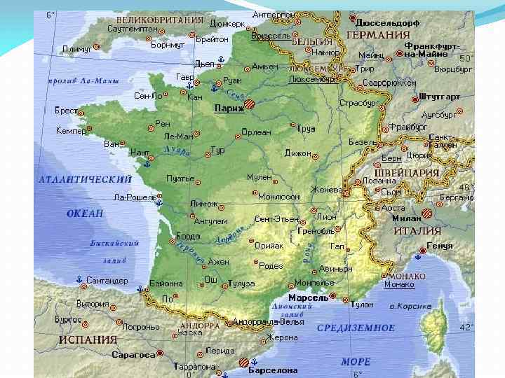 ЭГП Площадь-551 500 кв. км Столица - г. Париж Франции принадлежит остров Корсика в Средиземном море. Страна граничит с 8 странами: Италией, Испанией, Бельгией, Люксембургом, Германией, Швейцарией, Монако и Андоррой. Туннель под Ла-Маншем соединяет ее с Великобританией. На севере Франция омывается Атлантическим океаном (Бискайский залив и пролив Ла-Манш), а на юге Средиземным морем.