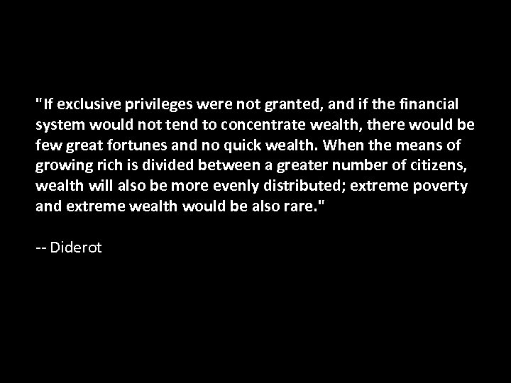 "If exclusive privileges were not granted, and if the financial system would not tend to concentrate wealth, there would be few great fortunes and no quick wealth. When the means of growing rich is divided between a greater number of citizens, wealth will also be more evenly distributed; extreme poverty and extreme wealth would be also rare. " -- Diderot