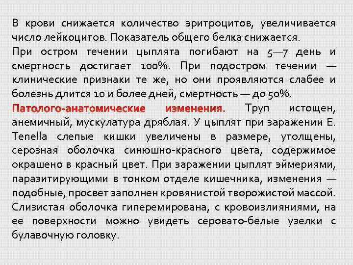 В крови снижается количество эритроцитов, увеличивается число лейкоцитов. Показатель общего белка снижается. При остром течении цыплята погибают на 5— 7 день и смертность достигает 100%. При подостром течении — клинические признаки те же, но они проявляются слабее и болезнь длится 10 и более дней, смертность — до 50%. Труп истощен, анемичный, мускулатура дряблая. У цыплят при заражении Е. Tenella слепые кишки увеличены в размере, утолщены, серозная оболочка синюшно-красного цвета, содержимое окрашено в красный цвет. При заражении цыплят эймериями, паразитирующими в тонком отделе кишечника, изменения — подобные, просвет заполнен кровянистой творожистой массой. Слизистая оболочка гиперемирована, с кровоизлияниями, на ее поверхности можно увидеть серовато-белые узелки с булавочную головку.