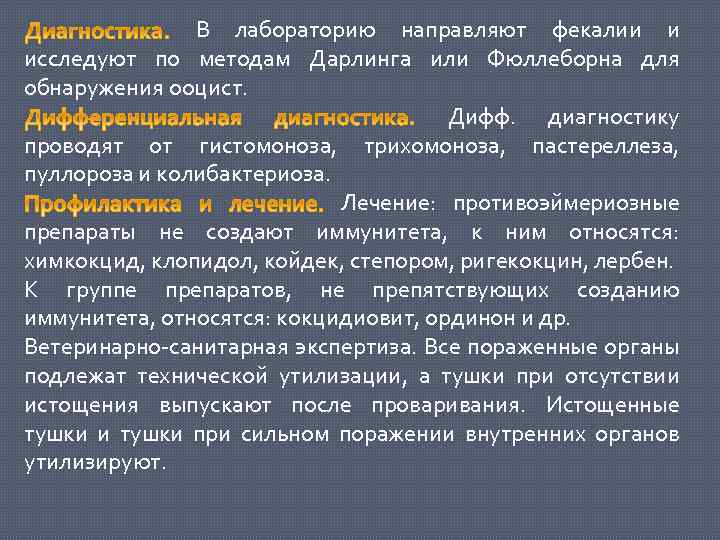В лабораторию направляют фекалии и исследуют по методам Дарлинга или Фюллеборна для обнаружения ооцист. Дифф. диагностику проводят от гистомоноза, трихомоноза, пастереллеза, пуллороза и колибактериоза. Лечение: противоэймериозные препараты не создают иммунитета, к ним относятся: химкокцид, клопидол, койдек, степором, ригекокцин, лербен. К группе препаратов, не препятствующих созданию иммунитета, относятся: кокцидиовит, ординон и др. Ветеринарно-санитарная экспертиза. Все пораженные органы подлежат технической утилизации, а тушки при отсутствии истощения выпускают после проваривания. Истощенные тушки и тушки при сильном поражении внутренних органов утилизируют.
