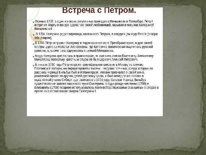 Ранние годы Сведения о молодости Екатерины I содержатся в основном в исторических анекдотах и недостаточно достоверны. До сих пор точно не определены её место рождения и национальность. По одной из версий, родилась она на территории современной Латвии, в исторической области Видземе, входившей на рубеже XVII—XVIII веков в состав шведской Ливонии, в семье латышского или литовского крестьянина родом из окрестностей Кегумса. По другой версии, будущая императрица родилась в Дерпте (ныне Тарту, Эстония) в семьеэстонских крестьян[2][3]. Родители Марты умерли от чумы в 1684 году, и её дядя отдал девочку в дом лютеранского пастора Эрнста Глюка, известного своим переводом Библии на латышский язык (после взятия Мариенбурга русскими войсками Глюк, как учёный человек, был взят на русскую службу, основал первую гимназию в Москве, преподавал языки и писал стихи по-русски). Марта использовалась в доме как служанка, грамоте её не учили. По версии, изложенной в словаре Брокгауза и Ефрона, мать Марты, овдовев, отдала дочь в услужение в семью пастора Глюка, где её будто бы учили грамоте и рукоделиям. По другой версии, до 12 лет девочка жила у своей тётки Анны-Марии Веселовской, прежде чем оказаться в семье Глюка.