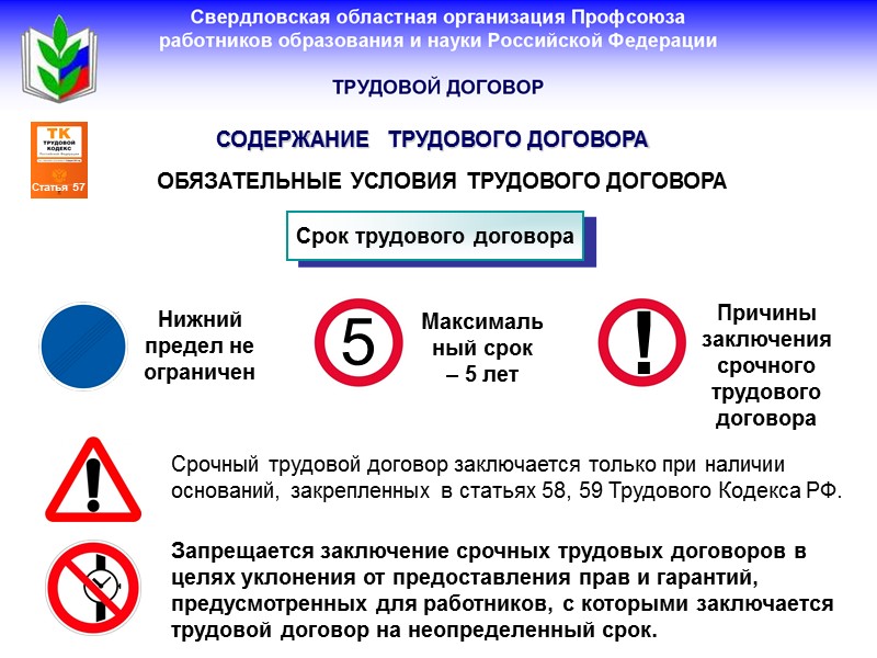 5 Максимальный срок – 5 лет СОДЕРЖАНИЕ ТРУДОВОГО ДОГОВОРА ОБЯЗАТЕЛЬНЫЕ УСЛОВИЯ ТРУДОВОГО ДОГОВОРА Срок трудового договора Нижний предел не ограничен ! Причины заключения срочного трудового договора Срочный трудовой договор заключается только при наличии оснований, закрепленных в статьях 58, 59 Трудового Кодекса РФ. Запрещается заключение срочных трудовых договоров в целях уклонения от предоставления прав и гарантий, предусмотренных для работников, с которыми заключается трудовой договор на неопределенный срок.