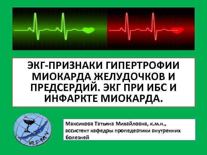 ЭКГ-ПРИЗНАКИ ГИПЕРТРОФИИ МИОКАРДА ЖЕЛУДОЧКОВ И ПРЕДСЕРДИЙ. ЭКГ ПРИ ИБС И ИНФАРКТЕ МИОКАРДА. Максикова Татьяна Михайловна, к. м. н. , ассистент кафедры пропедевтики внутренних болезней