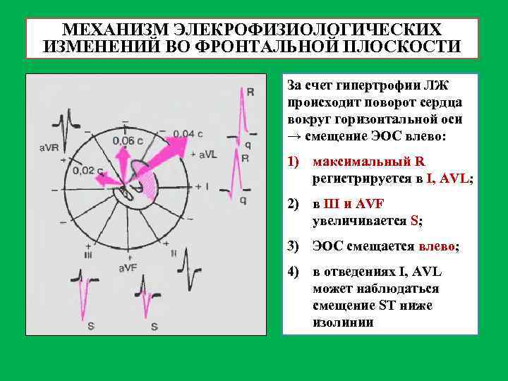 МЕХАНИЗМ ЭЛЕКРОФИЗИОЛОГИЧЕСКИХ ИЗМЕНЕНИЙ ВО ФРОНТАЛЬНОЙ ПЛОСКОСТИ За счет гипертрофии ЛЖ происходит поворот сердца вокруг горизонтальной оси → смещение ЭОС влево: 1) максимальный R регистрируется в I, AVL; 2) в III и AVF увеличивается S; 3) ЭОС смещается влево; 4) в отведениях I, AVL может наблюдаться смещение ST ниже изолинии