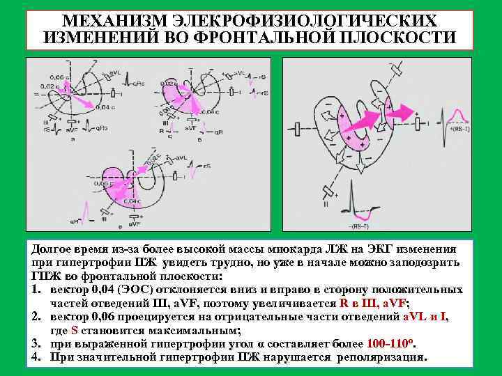 МЕХАНИЗМ ЭЛЕКРОФИЗИОЛОГИЧЕСКИХ ИЗМЕНЕНИЙ ВО ФРОНТАЛЬНОЙ ПЛОСКОСТИ Долгое время из-за более высокой массы миокарда ЛЖ на ЭКГ изменения при гипертрофии ПЖ увидеть трудно, но уже в начале можно заподозрить ГПЖ во фронтальной плоскости: 1. вектор 0, 04 (ЭОС) отклоняется вниз и вправо в сторону положительных частей отведений III, a. VF, поэтому увеличивается R в III, a. VF; 2. вектор 0, 06 проецируется на отрицательные части отведений a. VL и I, где S становится максимальным; 3. при выраженной гипертрофии угол α составляет более 100 -110º. 4. При значительной гипертрофии ПЖ нарушается реполяризация.