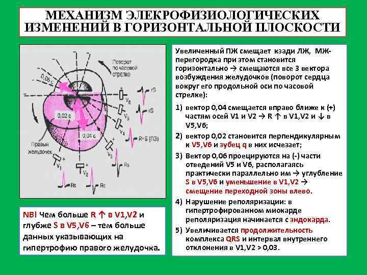 МЕХАНИЗМ ЭЛЕКРОФИЗИОЛОГИЧЕСКИХ ИЗМЕНЕНИЙ В ГОРИЗОНТАЛЬНОЙ ПЛОСКОСТИ Увеличенный ПЖ смещает кзади ЛЖ, МЖперегородка при этом становится горизонтально → смещаются все 3 вектора возбуждения желудочков (поворот сердца вокруг его продольной оси по часовой стрелке): NB! Чем больше R ↑ в V 1, V 2 и глубже S в V 5, V 6 – тем больше данных указывающих на гипертрофию правого желудочка. 1) вектор 0, 04 смещается вправо ближе к (+) частям осей V 1 и V 2 → R ↑ в V 1, V 2 и ↓ в V 5, V 6; 2) вектор 0, 02 становится перпендикулярным к V 5, V 6 и зубец q в них исчезает; 3) Вектор 0, 06 проецируются на (-) части отведений V 5 и V 6, располагаясь практически параллельно им → углубление S в V 5, V 6 и уменьшение в V 1, V 2 → смещение переходной зоны влево. 4) Нарушение реполяризации: в гипертрофированном миокарде реполяризация начинается с эндокарда. 5) Увеличивается продолжительность комплекса QRS и интервал внутреннего отклонения в V 1, V 2 > 0, 03.