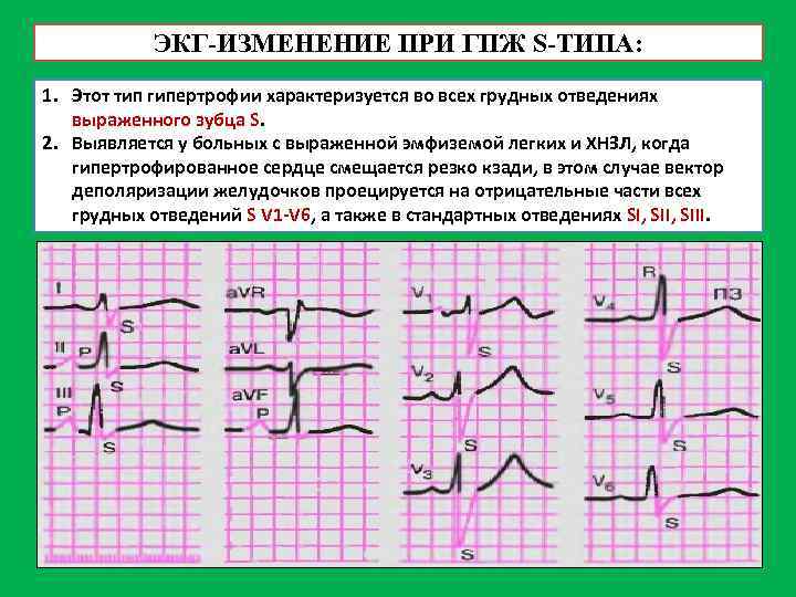 ЭКГ-ИЗМЕНЕНИЕ ПРИ ГПЖ S-ТИПА: 1. Этот тип гипертрофии характеризуется во всех грудных отведениях выраженного зубца S. 2. Выявляется у больных с выраженной эмфиземой легких и ХНЗЛ, когда гипертрофированное сердце смещается резко кзади, в этом случае вектор деполяризации желудочков проецируется на отрицательные части всех грудных отведений S V 1 -V 6, а также в стандартных отведениях SI, SIII.