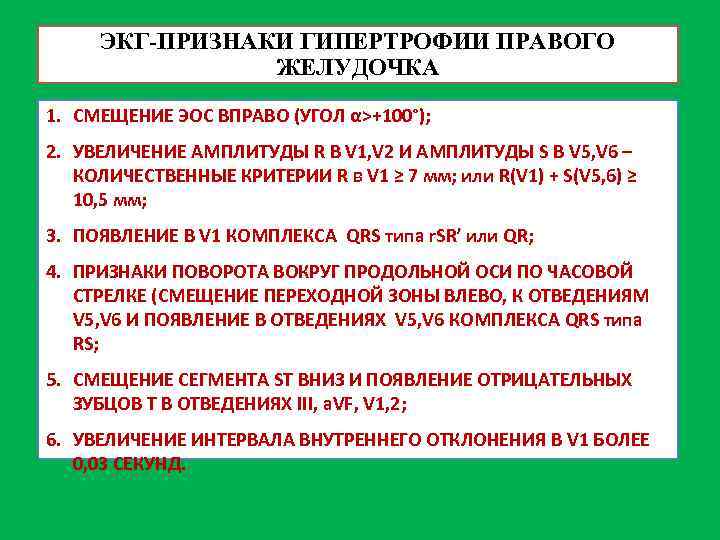 ЭКГ-ПРИЗНАКИ ГИПЕРТРОФИИ ПРАВОГО ЖЕЛУДОЧКА 1. СМЕЩЕНИЕ ЭОС ВПРАВО (УГОЛ α>+100°); 2. УВЕЛИЧЕНИЕ АМПЛИТУДЫ R В V 1, V 2 И АМПЛИТУДЫ S В V 5, V 6 – КОЛИЧЕСТВЕННЫЕ КРИТЕРИИ R в V 1 ≥ 7 мм; или R(V 1) + S(V 5, 6) ≥ 10, 5 мм; 3. ПОЯВЛЕНИЕ В V 1 КОМПЛЕКСА QRS типа r. SR′ или QR; 4. ПРИЗНАКИ ПОВОРОТА ВОКРУГ ПРОДОЛЬНОЙ ОСИ ПО ЧАСОВОЙ СТРЕЛКЕ (СМЕЩЕНИЕ ПЕРЕХОДНОЙ ЗОНЫ ВЛЕВО, К ОТВЕДЕНИЯМ V 5, V 6 И ПОЯВЛЕНИЕ В ОТВЕДЕНИЯХ V 5, V 6 КОМПЛЕКСА QRS типа RS; 5. СМЕЩЕНИЕ СЕГМЕНТА ST ВНИЗ И ПОЯВЛЕНИЕ ОТРИЦАТЕЛЬНЫХ ЗУБЦОВ Т В ОТВЕДЕНИЯХ III, a. VF, V 1, 2; 6. УВЕЛИЧЕНИЕ ИНТЕРВАЛА ВНУТРЕННЕГО ОТКЛОНЕНИЯ В V 1 БОЛЕЕ 0, 03 СЕКУНД.