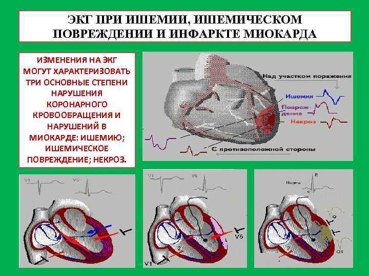 ЭКГ ПРИ ИШЕМИИ, ИШЕМИЧЕСКОМ ПОВРЕЖДЕНИИ И ИНФАРКТЕ МИОКАРДА ИЗМЕНЕНИЯ НА ЭКГ МОГУТ ХАРАКТЕРИЗОВАТЬ ТРИ ОСНОВНЫЕ СТЕПЕНИ НАРУШЕНИЯ КОРОНАРНОГО КРОВООБРАЩЕНИЯ И НАРУШЕНИЙ В МИОКАРДЕ: ИШЕМИЮ; ИШЕМИЧЕСКОЕ ПОВРЕЖДЕНИЕ; НЕКРОЗ.