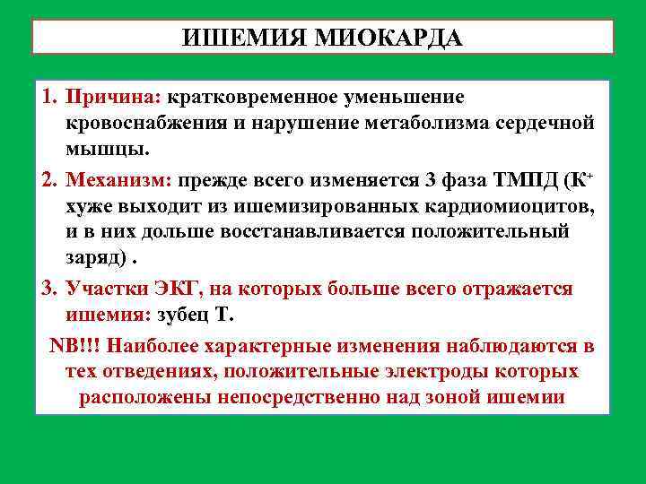 ИШЕМИЧЕСКОЕ ПОВРЕЖДЕНИЕ МИОКАРДА 1. Причина: более длительное, чем при ишемии уменьшение кровоснабжения и «дистрофия» (обратимая) мышечных волокон миокарда. 2. Механизм: прежде всего изменяется 2 фаза ТМПД (нарушается перемещение ионов Са²⁺ внутрь клетки, зона ишемического повреждения становится менее отрицательно заряженной, деполяризованной, по отношению к «здоровому» миокарду). 3. Участки ЭКГ, на которых больше всего отражается ишемия: сегмент SТ. NB!!! Наиболее характерные изменения наблюдаются в тех отведениях, положительные электроды которых расположены непосредственно над зоной ишемии