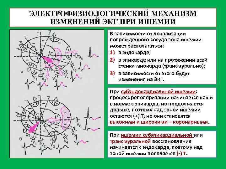 ЭЛЕКТРОФИЗИОЛОГИЧЕСКИЙ МЕХАНИЗМ ИЗМЕНЕНИЙ ЭКГ ПРИ ИШЕМИИ В зависимости от локализации поврежденного сосуда зона ишемии может располагаться: 1) в эндокарде; 2) в эпикарде или на протяжении всей стенки миокарда (трансмурально); 3) в зависимости от этого будут изменения на ЭКГ. При субэндокардиальной ишемии: процесс реполяризации начинается как и в норме с эпикарда, но продолжается дольше, поэтому над зоной ишемии остаются (+) Т, но они становятся высокими и широкими – коронарными. При ишемии субэпикардиальной или трансмуральной восстановление начинается с эндокарда, поэтому над зоной ишемии появляется (-) Т.