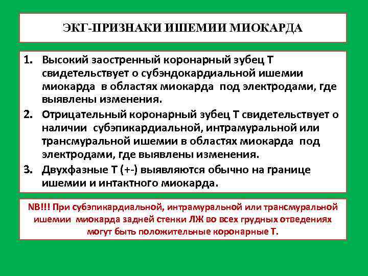 ЭКГ-ПРИЗНАКИ ИШЕМИИ МИОКАРДА 1. Высокий заостренный коронарный зубец Т свидетельствует о субэндокардиальной ишемии миокарда в областях миокарда под электродами, где выявлены изменения. 2. Отрицательный коронарный зубец Т свидетельствует о наличии субэпикардиальной, интрамуральной или трансмуральной ишемии в областях миокарда под электродами, где выявлены изменения. 3. Двухфазные Т (+-) выявляются обычно на границе ишемии и интактного миокарда. NB!!! При субэпикардиальной, интрамуральной или трансмуральной ишемии миокарда задней стенки ЛЖ во всех грудных отведениях могут быть положительные коронарные Т.