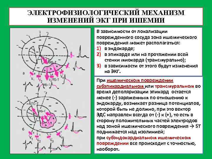 ЭЛЕКТРОФИЗИОЛОГИЧЕСКИЙ МЕХАНИЗМ ИЗМЕНЕНИЙ ЭКГ ПРИ ИШЕМИИ В зависимости от локализации поврежденного сосуда зона ишемического повреждения может располагаться: 1) в эндокарде; 2) в эпикарде или на протяжении всей стенки миокарда (трансмурально); 3) в зависимости от этого будут изменения на ЭКГ. При ишемическом повреждении субэпикардиальном или трансмуральном во время деполяризации эпикард остается менее (-) заряженным по отношению к эндокарду, возникает разница потенциалов, которой быть не должно, при это вектор ЭДС направлен всегда от (-) к (+), то есть в сторону положительных частей электродов над зоной ишемического повреждения → ST поднимается над изолинией; при субэндокардиальном ишемическом повреждении все происходит с точностью, наоборот.