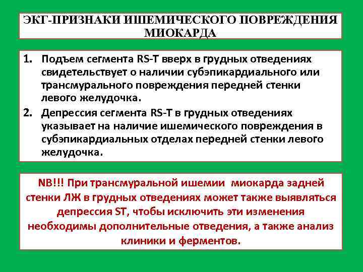 ЭКГ-ПРИЗНАКИ ИШЕМИЧЕСКОГО ПОВРЕЖДЕНИЯ МИОКАРДА 1. Подъем сегмента RS-T вверх в грудных отведениях свидетельствует о наличии субэпикардиального или трансмурального повреждения передней стенки левого желудочка. 2. Депрессия сегмента RS-T в грудных отведениях указывает на наличие ишемического повреждения в субэпикардиальных отделах передней стенки левого желудочка. NB!!! При трансмуральной ишемии миокарда задней стенки ЛЖ в грудных отведениях может также выявляться депрессия ST, чтобы исключить эти изменения необходимы дополнительные отведения, а также анализ клиники и ферментов.