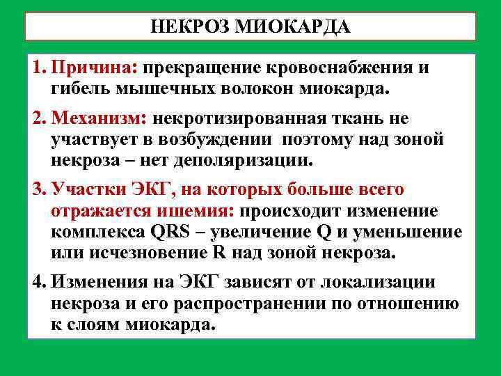 НЕКРОЗ МИОКАРДА 1. Причина: прекращение кровоснабжения и гибель мышечных волокон миокарда. 2. Механизм: некротизированная ткань не участвует в возбуждении поэтому над зоной некроза – нет деполяризации. 3. Участки ЭКГ, на которых больше всего отражается ишемия: происходит изменение комплекса QRS – увеличение Q и уменьшение или исчезновение R над зоной некроза. 4. Изменения на ЭКГ зависят от локализации некроза и его распространении по отношению к слоям миокарда.