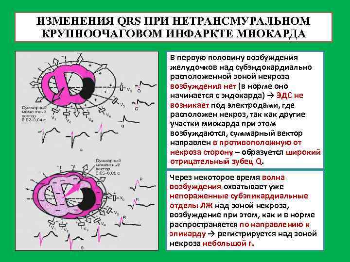 ИЗМЕНЕНИЯ QRS ПРИ НЕТРАНСМУРАЛЬНОМ КРУПНООЧАГОВОМ ИНФАРКТЕ МИОКАРДА В первую половину возбуждения желудочков над субэндокардиально расположенной зоной некроза возбуждения нет (в норме оно начинается с эндокарда) → ЭДС не возникает под электродами, где расположен некроз, так как другие участки миокарда при этом возбуждаются, суммарный вектор направлен в противоположную от некроза сторону – образуется широкий отрицательный зубец Q. Через некоторое время волна возбуждения охватывает уже непораженные субэпикардиальные отделы ЛЖ над зоной некроза, возбуждение при этом, как и в норме распространяется по направлению к эпикарду → регистрируется над зоной некроза небольшой r.