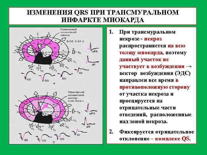 ИЗМЕНЕНИЯ QRS ПРИ ТРАНСМУРАЛЬНОМ ИНФАРКТЕ МИОКАРДА 1. При трансмуральном некрозе - некроз распространяется на всю толщу миокарда, поэтому данный участок не участвует в возбуждении → вектор возбуждения (ЭДС) направлен все время в противоположную сторону от участка некроза и проецируется на отрицательные части отведений, расположенные над зоной некроза. 2. Фиксируется отрицательное отклонение – комплекс QS.