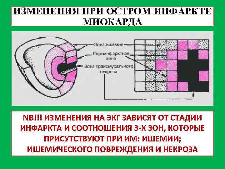 ИЗМЕНЕНИЯ ПРИ ОСТРОМ ИНФАРКТЕ МИОКАРДА NB!!! ИЗМЕНЕНИЯ НА ЭКГ ЗАВИСЯТ ОТ СТАДИИ ИНФАРКТА И СООТНОШЕНИЯ 3 -Х ЗОН, КОТОРЫЕ ПРИСУТСТВУЮТ ПРИ ИМ: ИШЕМИИ; ИШЕМИЧЕСКОГО ПОВРЕЖДЕНИЯ И НЕКРОЗА
