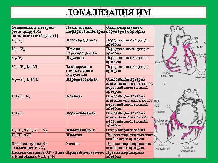 ЛОКАЛИЗАЦИЯ ИМ Отведения, в которых регистрируется патологический зубец Q V 1, V 2 Локализация Окклюзированная инфаркта миокарда коронарная артерия V 1—V 4 Переднеперегородочная Передняя V 3, V 4 V 1—V 6, I, a. VL V 3—V 6, I, a. VL Перегородочная Вся передняя стенка левого желудочка Переднебоковая Передняя нисходящая артерия Огибающая артерия или диагональная ветвь передней нисходящей артерии I, a. VL, V 6 Боковая Огибающая артерия или диагональная ветвь передней нисходящей артерии I, a. VL Верхнебоковая Огибающая артерия или диагональная ветвь передней нисходящей артерии II, III, a. VF, V 4—V 6 Нижнебоковая Огибающая артерия II, III, a. VF Нижняя Правая коронарная или огибающая артерия Высокие зубцы R в Задняя Правая коронарная или отведениях V 1, V 2 огибающая артерия Подъем сегмента ST > 1 мм Правый желудочек Правая коронарная в отведениях V 3 R, V 4 R артерия