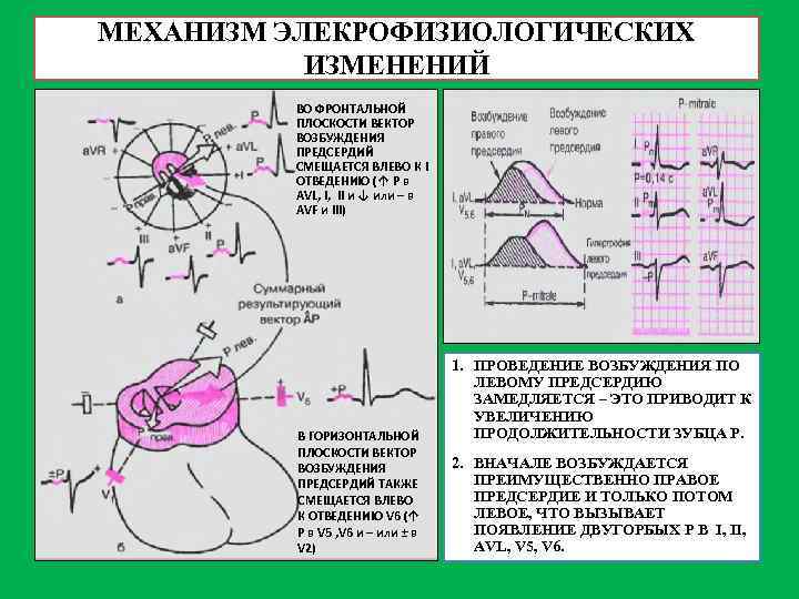 МЕХАНИЗМ ЭЛЕКРОФИЗИОЛОГИЧЕСКИХ ИЗМЕНЕНИЙ ВО ФРОНТАЛЬНОЙ ПЛОСКОСТИ ВЕКТОР ВОЗБУЖДЕНИЯ ПРЕДСЕРДИЙ СМЕЩАЕТСЯ ВЛЕВО К I ОТВЕДЕНИЮ (↑ P в AVL, I, II и ↓ или – в AVF и III) В ГОРИЗОНТАЛЬНОЙ ПЛОСКОСТИ ВЕКТОР ВОЗБУЖДЕНИЯ ПРЕДСЕРДИЙ ТАКЖЕ СМЕЩАЕТСЯ ВЛЕВО К ОТВЕДЕНИЮ V 6 (↑ P в V 5 , V 6 и – или ± в V 2) 1. ПРОВЕДЕНИЕ ВОЗБУЖДЕНИЯ ПО ЛЕВОМУ ПРЕДСЕРДИЮ ЗАМЕДЛЯЕТСЯ – ЭТО ПРИВОДИТ К УВЕЛИЧЕНИЮ ПРОДОЛЖИТЕЛЬНОСТИ ЗУБЦА Р. 2. ВНАЧАЛЕ ВОЗБУЖДАЕТСЯ ПРЕИМУЩЕСТВЕННО ПРАВОЕ ПРЕДСЕРДИЕ И ТОЛЬКО ПОТОМ ЛЕВОЕ, ЧТО ВЫЗЫВАЕТ ПОЯВЛЕНИЕ ДВУГОРБЫХ Р В I, II, AVL, V 5, V 6.