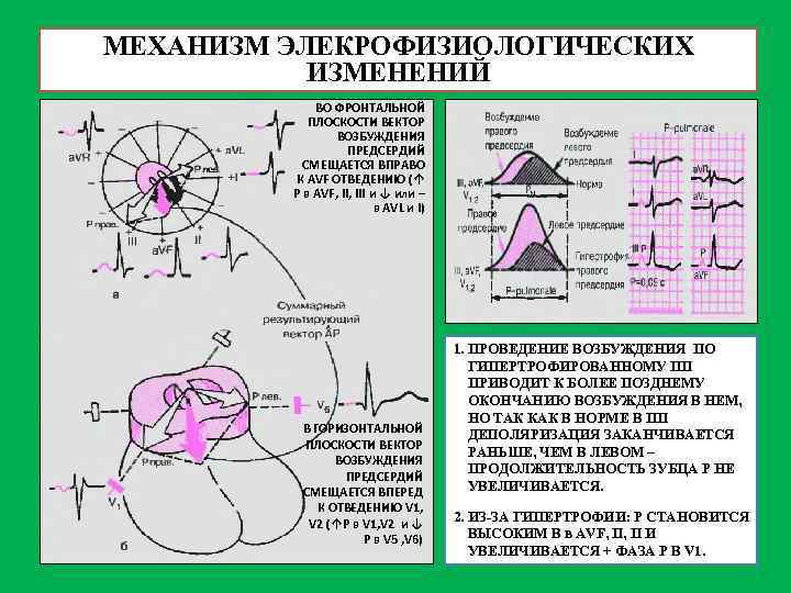 МЕХАНИЗМ ЭЛЕКРОФИЗИОЛОГИЧЕСКИХ ИЗМЕНЕНИЙ ВО ФРОНТАЛЬНОЙ ПЛОСКОСТИ ВЕКТОР ВОЗБУЖДЕНИЯ ПРЕДСЕРДИЙ СМЕЩАЕТСЯ ВПРАВО К AVF ОТВЕДЕНИЮ (↑ P в AVF, III и ↓ или – в AVL и I) В ГОРИЗОНТАЛЬНОЙ ПЛОСКОСТИ ВЕКТОР ВОЗБУЖДЕНИЯ ПРЕДСЕРДИЙ СМЕЩАЕТСЯ ВПЕРЕД К ОТВЕДЕНИЮ V 1, V 2 (↑P в V 1, V 2 и ↓ P в V 5 , V 6) 1. ПРОВЕДЕНИЕ ВОЗБУЖДЕНИЯ ПО ГИПЕРТРОФИРОВАННОМУ ПП ПРИВОДИТ К БОЛЕЕ ПОЗДНЕМУ ОКОНЧАНИЮ ВОЗБУЖДЕНИЯ В НЕМ, НО ТАК КАК В НОРМЕ В ПП ДЕПОЛЯРИЗАЦИЯ ЗАКАНЧИВАЕТСЯ РАНЬШЕ, ЧЕМ В ЛЕВОМ – ПРОДОЛЖИТЕЛЬНОСТЬ ЗУБЦА Р НЕ УВЕЛИЧИВАЕТСЯ. 2. ИЗ-ЗА ГИПЕРТРОФИИ: Р СТАНОВИТСЯ ВЫСОКИМ В в AVF, II И УВЕЛИЧИВАЕТСЯ + ФАЗА Р В V 1.