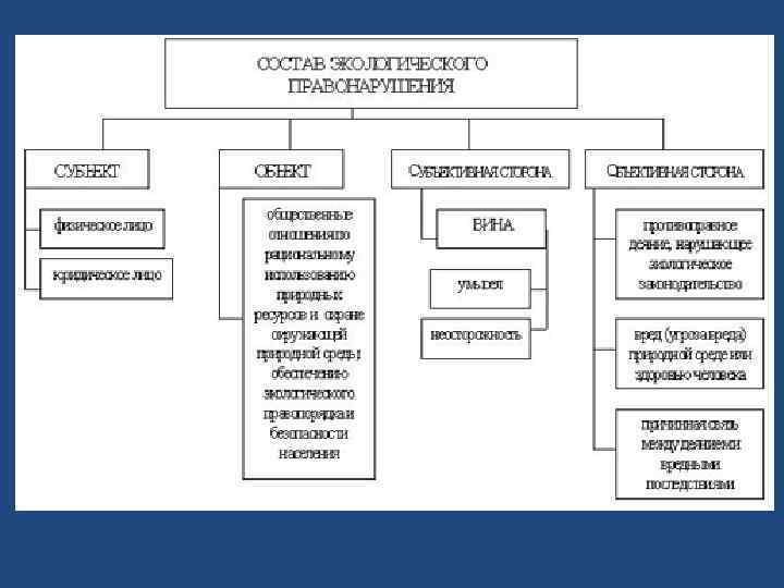 Экологическое правонарушение – виновное, противоправное деяние (действие или бездействие), нарушающее природоохранное законодательство и причиняющее вред окружающей среде и здоровью человека.