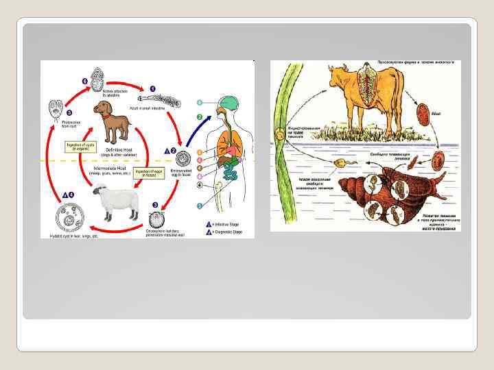 Циклы развития паразитов Совокупность стадий онтогенеза паразитов и путей передачи его от одного хозяина к другому называют жизненным циклом. Окончательный хозяин – в нем развивается и размножается половозрелая стадия. Промежуточный хозяин - в нем обитает личинка. Резервуар – хозяин в котором возбудитель может жить долго, размножаясь и расселяясь по окружающей территории. Гельминты: Биогельминты – гельминты для развития которых необходимо участие промежуточного хозяина (описторх, бычий цепень, широкий лентец). Геогельминты – гельминты для развития которых необходимо пребывание в почве (аскарида, власоглав). Контактные гельминтозы (карликовый цепень, острица). дополнительный хозяин, или второй промежуточный (хищные рыбы для широкого лентеца) Резервуарный (накопление инвазионных стадий паразита (дикие грызуны для лейшманий