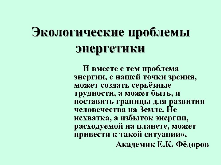Экологические проблемы энергетики И вместе с тем проблема энергии, с нашей точки зрения, может создать серьёзные трудности, а может быть, и поставить границы для развития человечества на Земле. Не нехватка, а избыток энергии, расходуемой на планете, может привести к такой ситуации» . Академик Е. К. Фёдоров