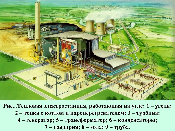 Рис. . . Тепловая электростанция, работающая на угле: 1 – уголь; 2 – топка с котлом и пароперегревателем; 3 – турбина; 4 – генератор; 5 – трансформатор; 6 – конденсаторы; 7 – градирня; 8 – зола; 9 – труба.
