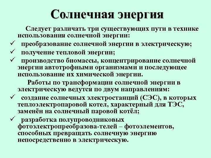Солнечная энергия Следует различать три существующих пути в технике использования солнечной энергии: ü преобразование солнечной энергии в электрическую; ü получение тепловой энергии; ü производство биомассы, концентрирование солнечной энергии автотрофными организмами и последующее использование их химической энергии. Работы по трансформации солнечной энергии в электрическую ведутся по двум направлениям: ü создание солнечных электростанций (СЭС), в которых теплоэлектропаровой котел, характерный для ТЭС, заменён на солнечный паровой котёл; ü разработка полупроводниковых фотоэлектропреобразова телей – фотоэлементов, способных превращать солнечную энергию непосредственно в электрическую.