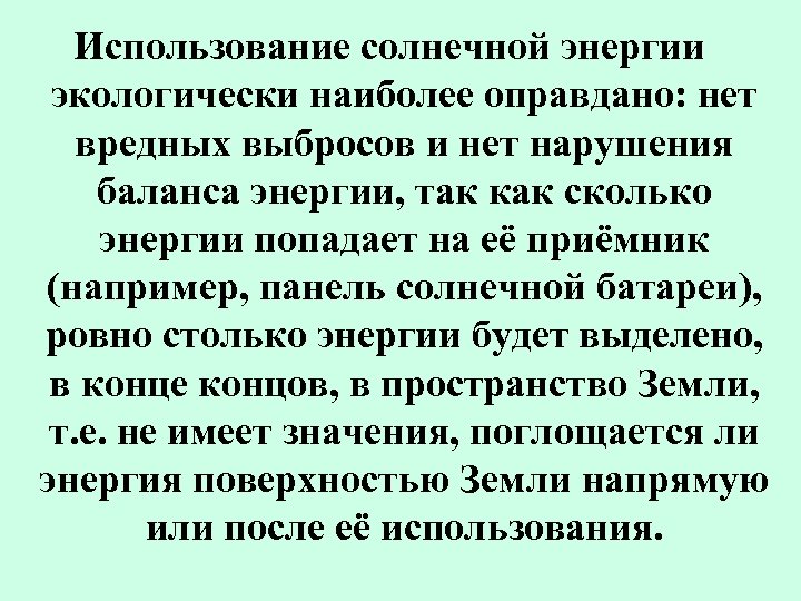 Использование солнечной энергии экологически наиболее оправдано: нет вредных выбросов и нет нарушения баланса энергии, так как сколько энергии попадает на её приёмник (например, панель солнечной батареи), ровно столько энергии будет выделено, в конце концов, в пространство Земли, т. е. не имеет значения, поглощается ли энергия поверхностью Земли напрямую или после её использования.